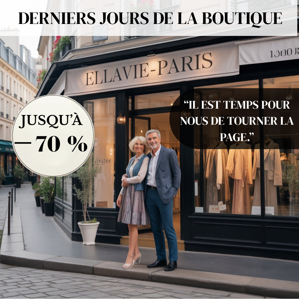 Avant de tourner la page, nous proposons notre dernière collection — jusqu’à -70 % sur les pièces restantes. Ce sont les dernières créations Ellavie-Paris : une fois parties, elles le seront pour de bon.