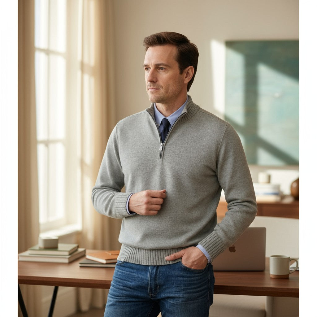 Sa maille fine et douce procure une chaleur réconfortante sans jamais être lourde, tandis que le col soigné et la demi-fermeture zippée apportent une touche de raffinement discret.